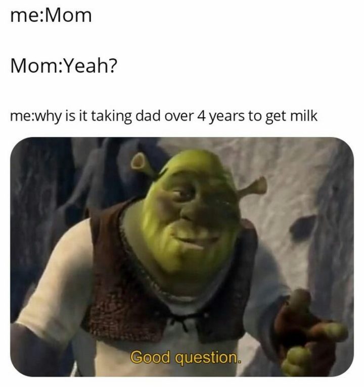 “Me: Mom? Mom: Yeah? Me: Why is it taking dad over 4 years to get milk?”