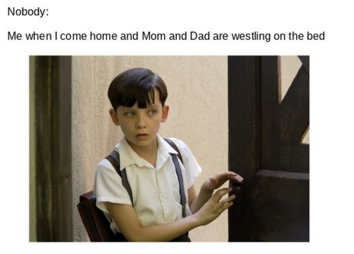 “Nobody: Me: When I come home and mom and dad are wrestling on the bed.”