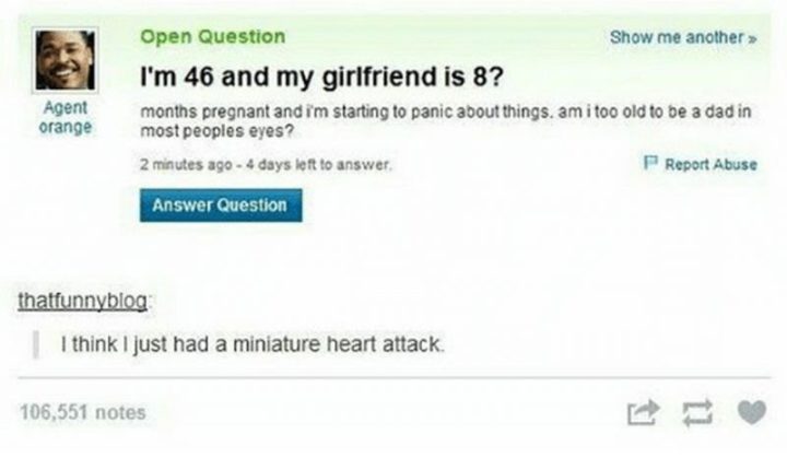 “Agent Orange: I”m 46 and my girlfriend is 8? months pregnant and I’m starting to panic about things. Am I too old to be a dad in most people’s eyes? thatfunnyblog: I think I just had a miniature heart attack.”