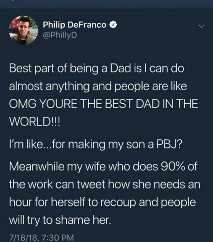“Best part of being a dad is I can do almost anything and people are like OMG, YOU”RE THE BEST DAD IN THE WORLD!!! I’m like…for making my son a PBJ? Meanwhile, my wife who does 90% of the work can tweet how she needs an hour for herself to recoup and people will try to shame her.”