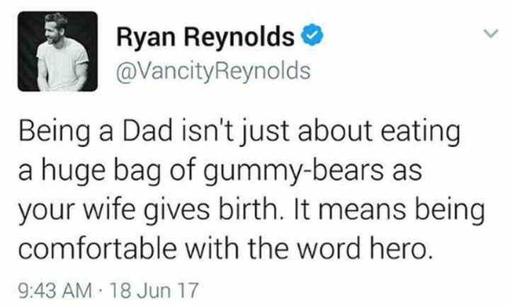 “Being a dad isn’t just about eating a huge bag of gummy bears as your wife gives birth. It means being comfortable with the word hero.”