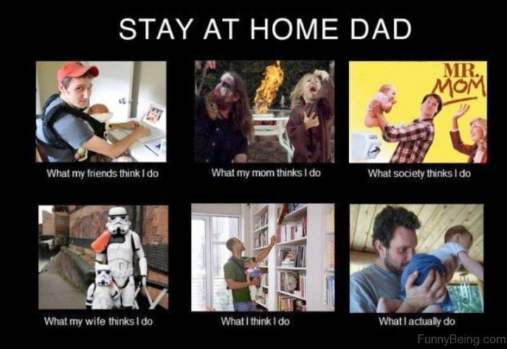 “Stay at home dad memes: What my friends think I do. What my mom thinks I do. What society thinks I do. What my wife thinks I do. What I think I do. What I actually do.”