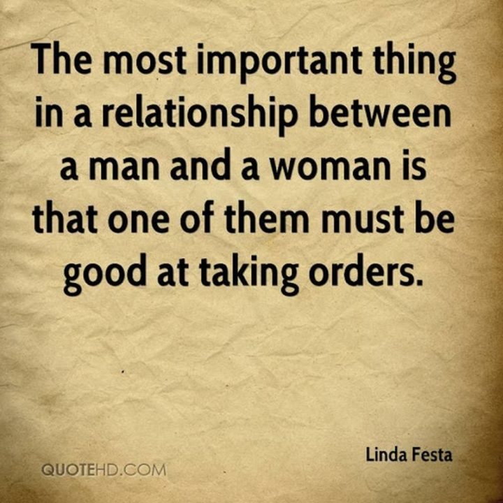 “The most important thing in a relationship between a man and a woman is that one of them be good at taking orders.” – Linda Festa