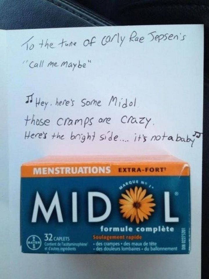“To the tune of Carly Rae Jepsen’s ‘Call Me Maybe’…Hey, here’s some Midol. Those cramps are crazy. Here’s the bright side…it’s not a baby.” – Unknown