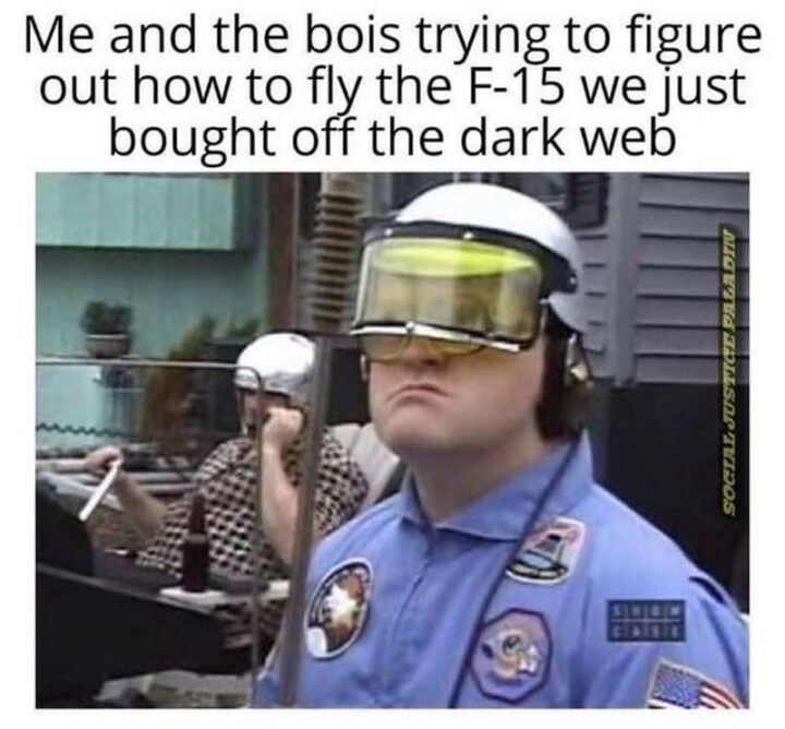 “Me and the Bois trying to figure out how to fly the F-15 we just bought off the dark web.”
