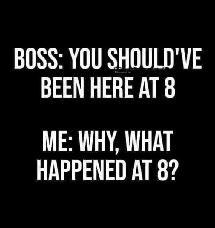 “Boss: You should’ve been here at 8. Me: Why what happened at 8?”