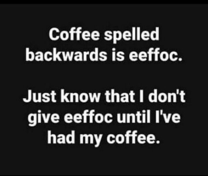 “Coffee spelled backward is eeffoc. Just know that I don’t give eeffoc until I’ve had my coffee.”