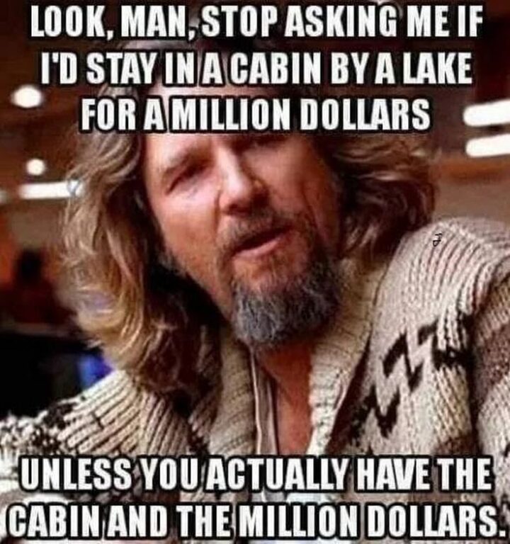 “Look, man, stop asking me if I’d stay in a cabin by a lake for a million dollars unless you actually have the cabin and the million dollars.”