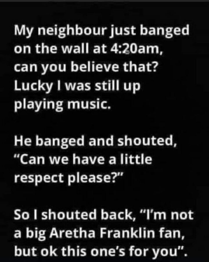 “My neighbor just banged on the wall at 4:20 am, can you believe that? Luckily I was still up playing music. He banged and shouted, “Can we have a little respect please?”. So I shouted back, “I’m not a big Aretha Franklin fan, but ok this one’s for you”.”