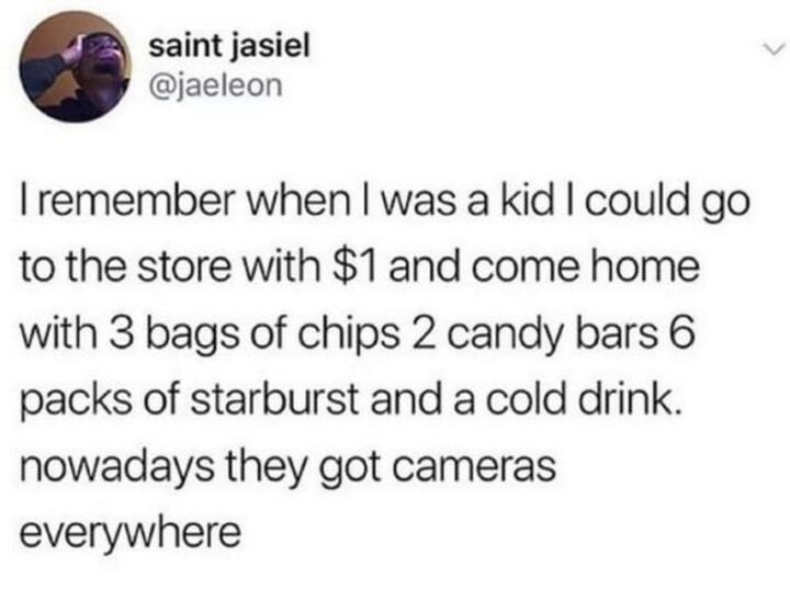 “I remember when I was a kid I could go the store with $1 and come home with 3 bags of chips, 2 candy bars, 6 packs of starburst, and a cold drink. Nowadays they got cameras everywhere.”
