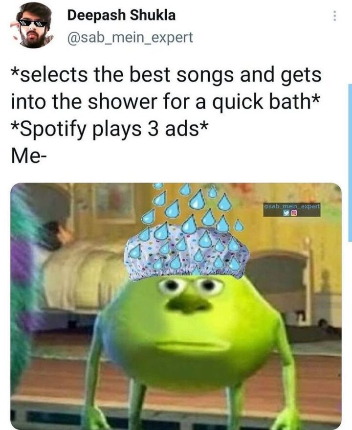 “*selects the best songs and gets into the shower for a quick bath* *Spotify plays 3 ads* Me-“