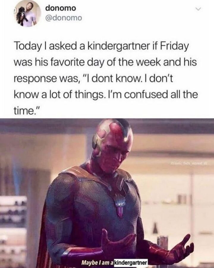 “Today I asked a kindergartner if Friday was his favorite day of the week and his response was, “I don’t know. I don’t know a lot of things. I’m confused all the time”. Maybe I am a kindergartner.”