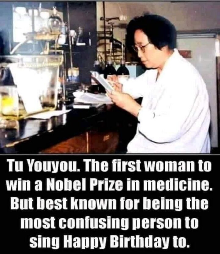 “Tu Youyou. The first woman to win a Nobel Price in medicine. But best known for being the most confusing person to sing Happy Birthday to.”