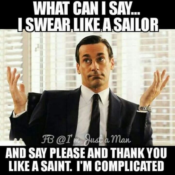 “What can I say…I swear like a sailor and say please and thank you like a saint. I’m complicated.”