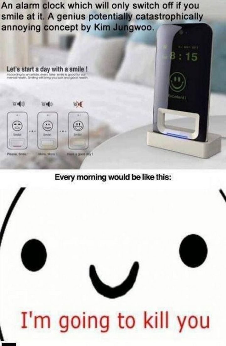 “An alarm clock which will only switch off if you smile at it. A genius potentially catastrophically annoying concept by Kim Jungwoo. Every morning would be like this: I’m going to kill you.”