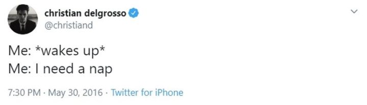 “Me: *wakes up*. Me: I need a nap.”