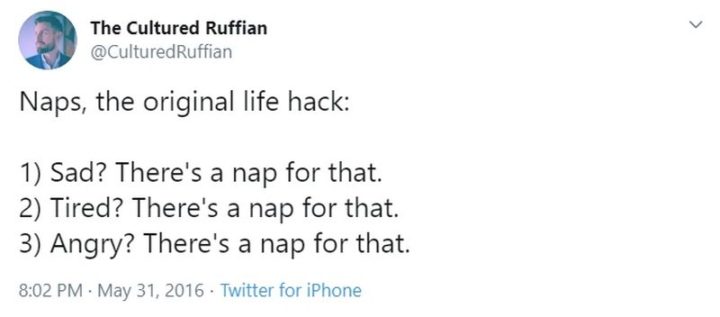 “Naps, the original life hack: 1) Sad? There’s a nap for that. 2) Tired? There’s a nap for that. 3) Angry? There’s a nap for that.”