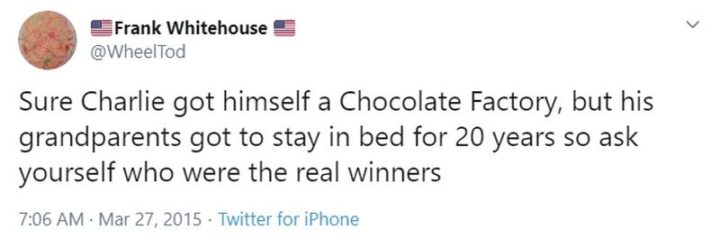 “Sure Charlie got himself a Chocolate Factory, but his grandparents got to stay in bed for 20 years so ask yourself who were the real winners.”