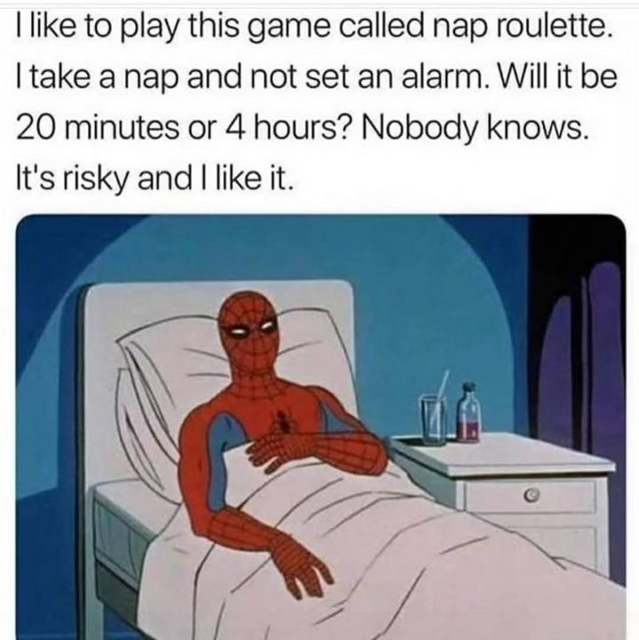 “I like to play this game called nap roulette. I take a nap and do not set an alarm. Will it be 20 minutes or 4 hours? Nobody knows. It’s risky and I like it.”