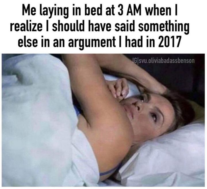 “Me laying in bed at 3 am when I realize I should have said something else in an argument I had in 2017.”