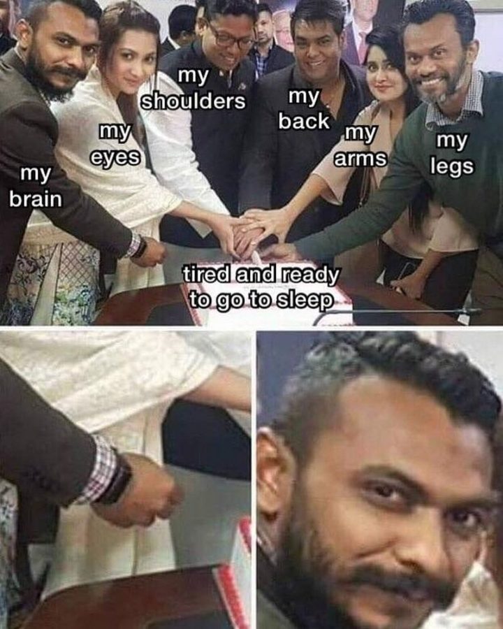 “My brain. My eyes. My shoulders. My back. My arms. My legs. Tired and ready to go to sleep (with memes).”