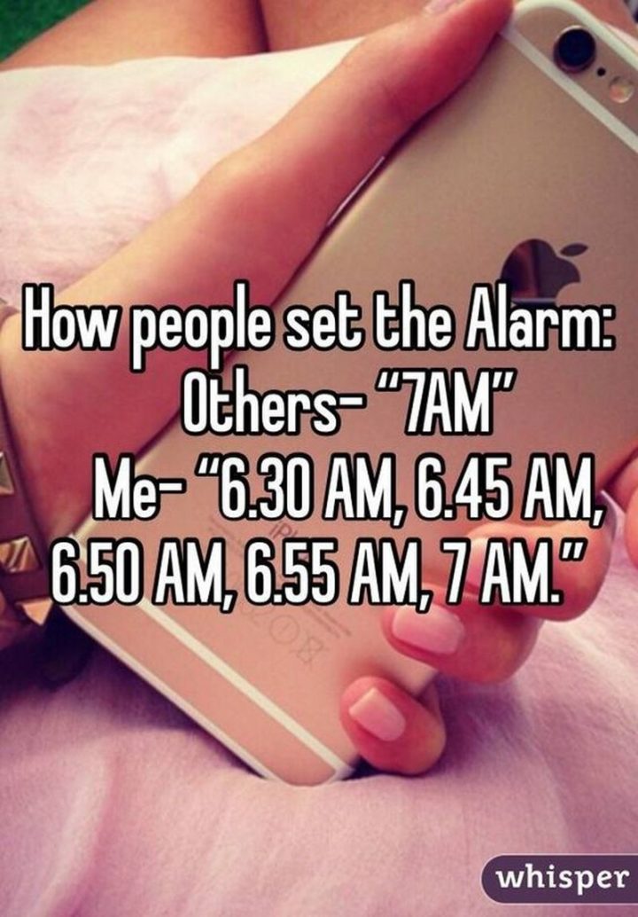 “I don’t always set an alarm for the next morning but when I do, I set it 45 minutes before I need to get up and snooze it 9 times in a row.”