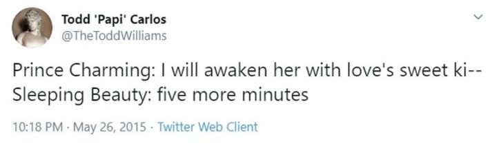 “Prince Charming: I will awaken her with love’s sweet ki–. Sleeping Beauty: five more minutes.”