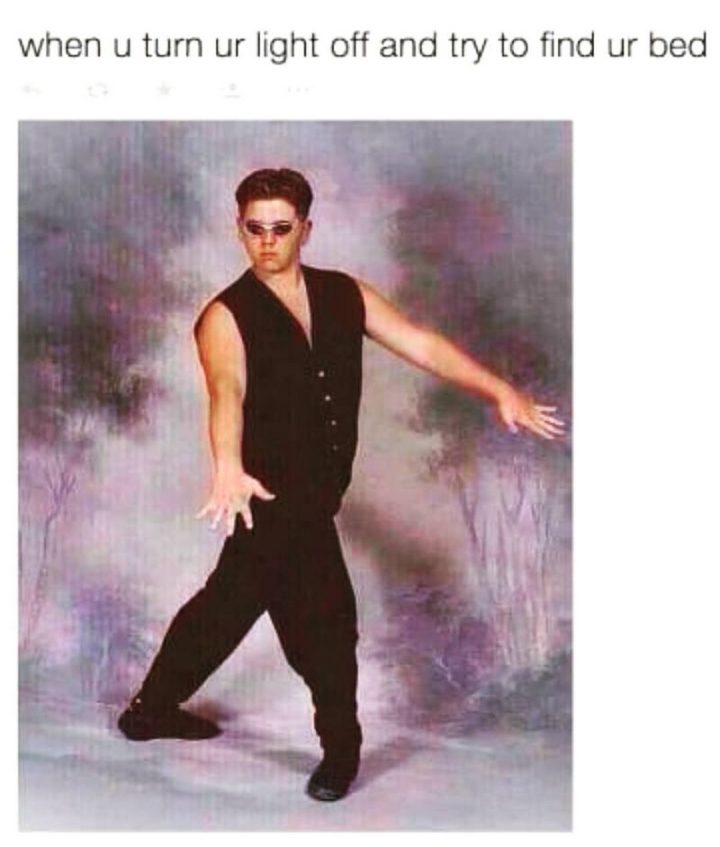 “When u turn ur light off and try to find your bed.”