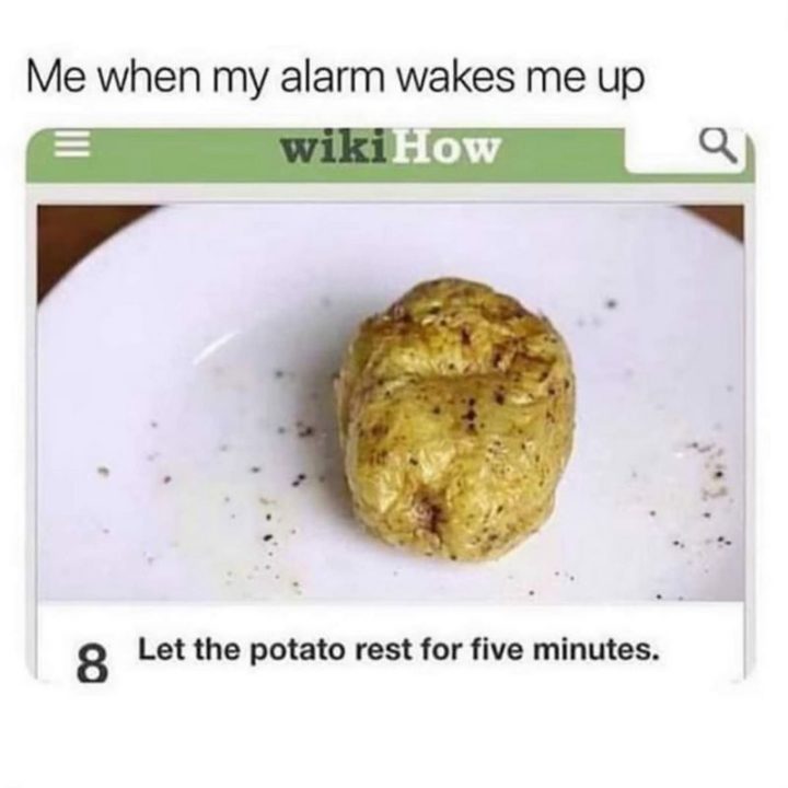 “Me when my alarm wakes me up: Let the potato rest for five minutes.”