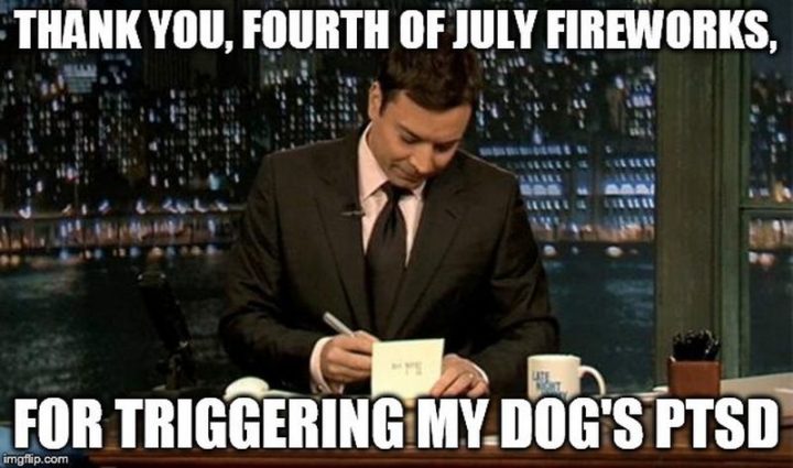 “Thank you, fourth of July fireworks, for triggering my dog’s PTSD.”
