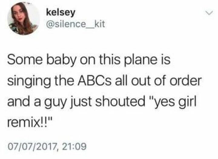 1) “Some baby on this plane is singing the ABCs all out of order and a guy just shouted ‘Yes girl remix!!'”