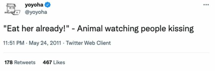 7) “‘Eat her already!’ – Animal watching people kissing.”