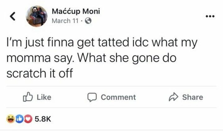 8) “I’m just finna get tatted I don’t care what my momma says. What she gonna do scratch it off.”