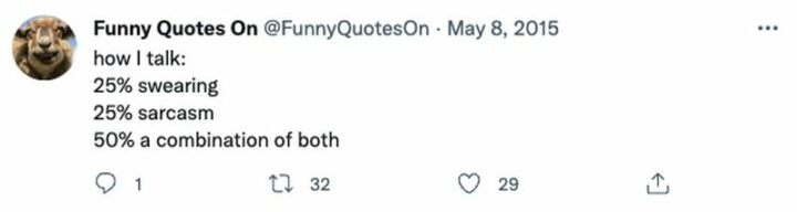 10) “How I talk: 25% swearing. 25% sarcasm. 50% a combination of both.”