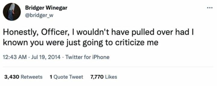 11) “Honestly, Officer, I wouldn’t have pulled over had I known you were just going to criticize me.”