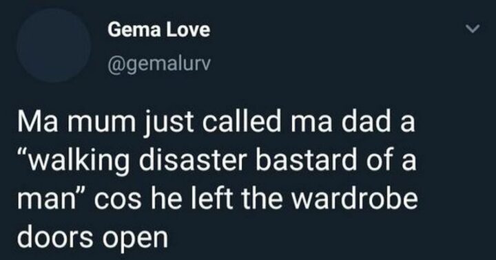 15) “Ma mum just called ma dad a ‘walking disaster bastard of a man’ cos he left the wardrobe doors open.”
