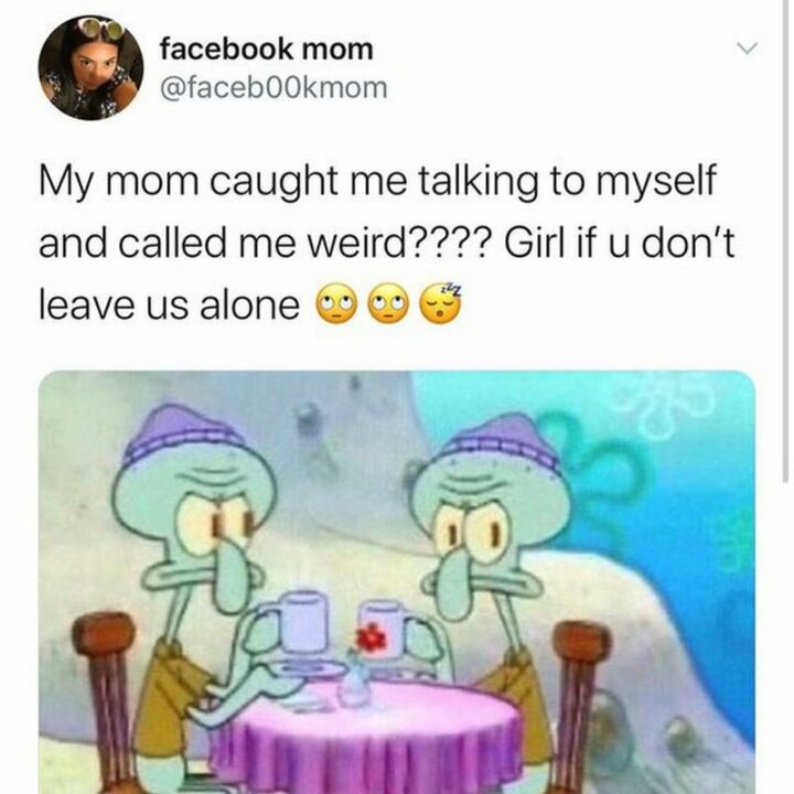 17) “My mom caught me talking to myself and called me weird???? Girl if u don’t leave us alone.”