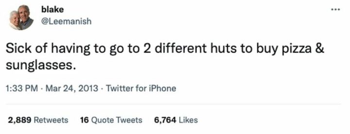 20) “Sick of having to go to 2 different huts to buy pizza and sunglasses.”