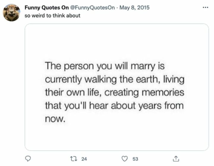 21) “So weird to think about: The person you will marry is currently walking the earth, living their own life, creating memories that you’ll hear about years from now.”