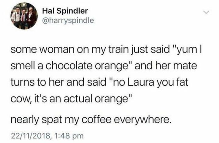 22) “Some woman on my train just said ‘Yum I smell a chocolate orange’ and her mate turns to her and said ‘No Laura you fat cow, it’s an actual orange’. Nearly spat my coffee everywhere.”