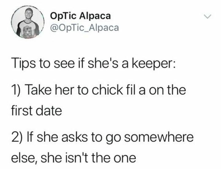 25) “Tips to see if she’s a keeper: 1) Take her to Chick-fil-A on the first date. 2) If she asks to go somewhere else, she isn’t the one.”