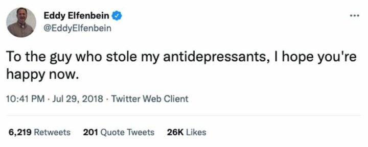 26) “To the guy who stole my antidepressants, I hope you’re happy now.”