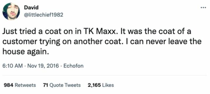 27) “Just tried a coat on in TK Maxx. It was the coat of a customer trying on another coat. I can never leave the house again.”