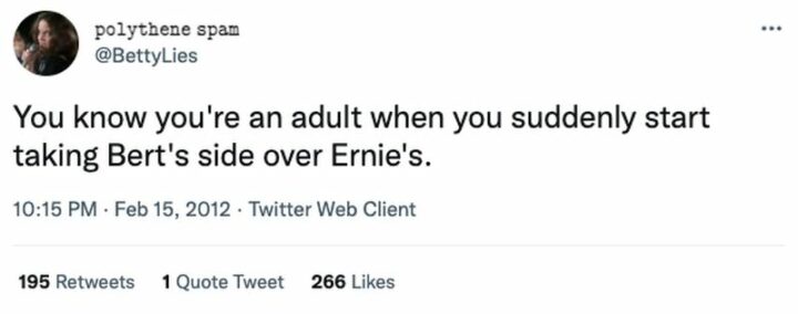 29) “You know you’re an adult when you suddenly start taking Bert’s side over Ernie’s.”
