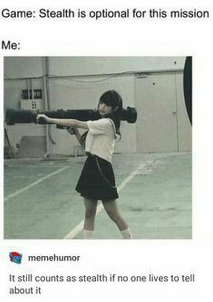 “Game: Stealth is optional for this mission. Me: It still counts as stealth if no one lives to tell about it.”