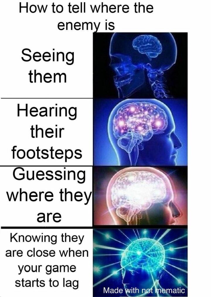 “How to tell where the enemy is: Seeing them. Hearing their footsteps. Guessing where they are. Knowing they are close when the game starts to lag.”