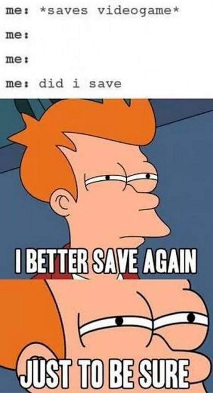 “Me: *saves videogame* Me: Did I save? I better save again. Just to be sure.”