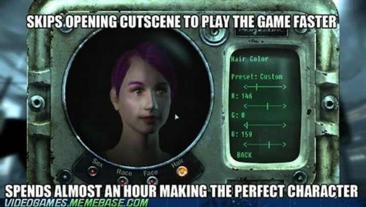 “Skips opening cutscene to play game faster. Spends almost an hour making a perfect character.”