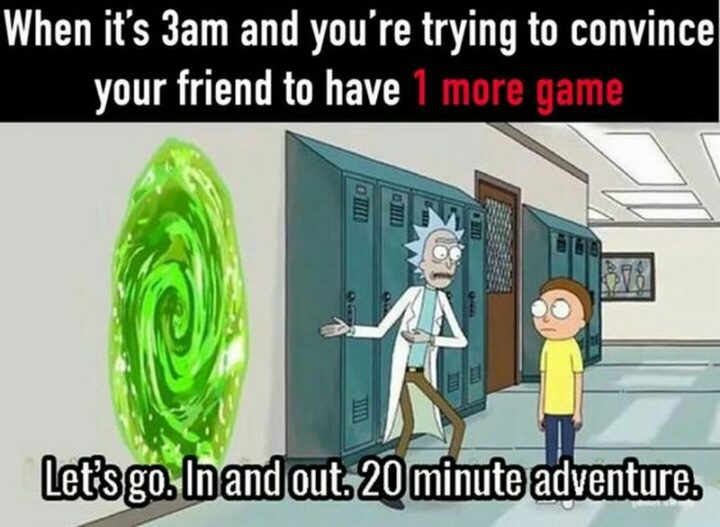 “When it’s 3 am and you’re trying to convince your friend to have 1 more game. Let’s go. In and out. 20-minute adventure.”