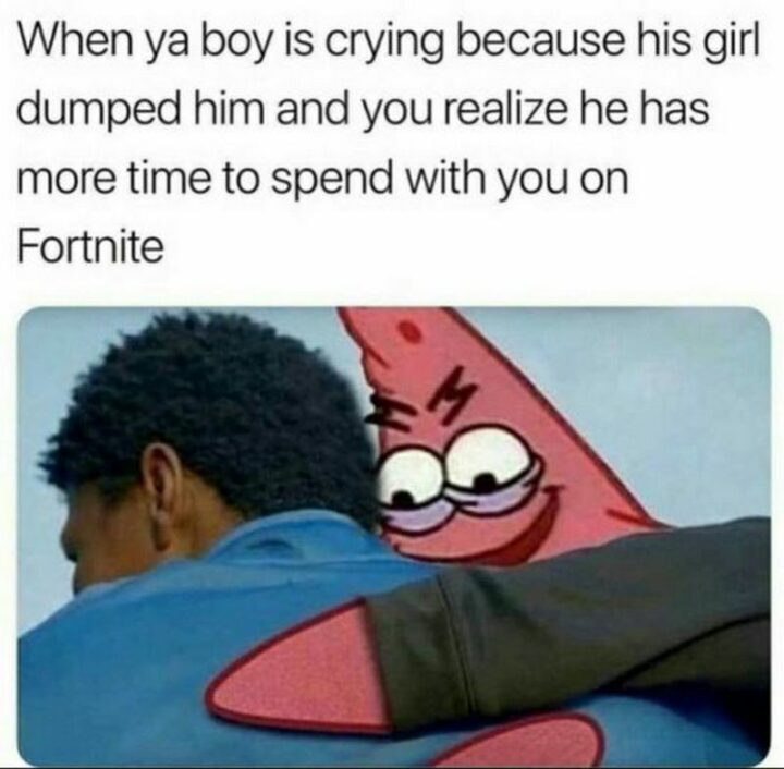 “When ya boy is crying because his girl dumped him and you realize he has more time to spend with you on Fortnite.”